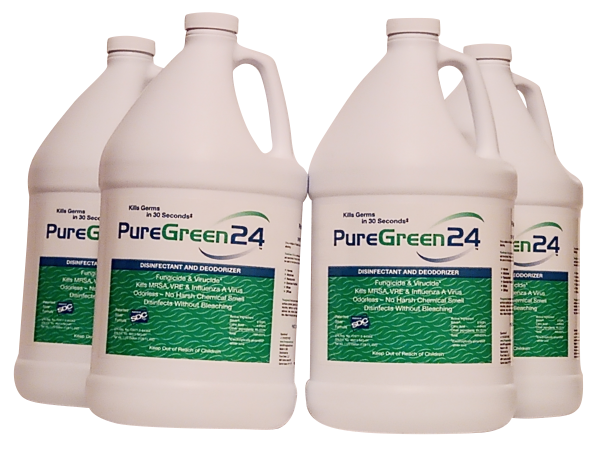 PureGreen24 is an EPA registered, broad spectrum antimicrobial disinfectant with unique 24 hour residual effectiveness. PureGreen24 kills the most deadly of superbugs, yet also kills everyday household germs.